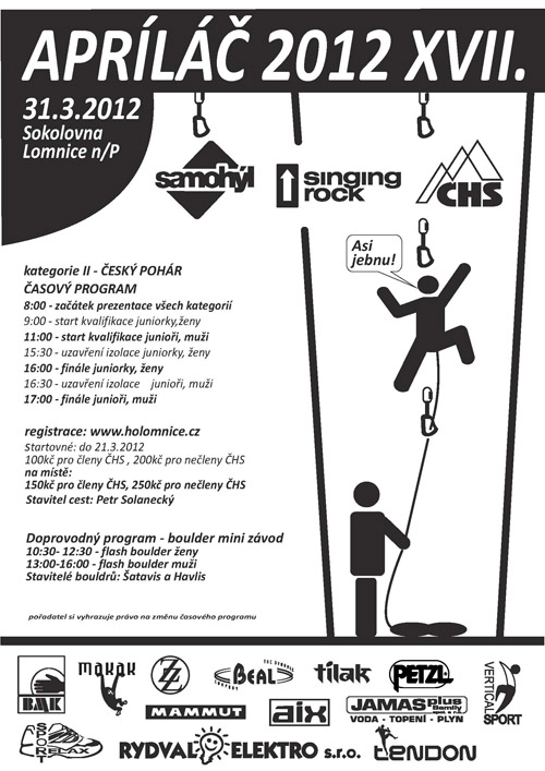 Už to skoro vypadá, že ty závody děláme  hlavně pro prachy, ale kdo závody pořádá, ví, o čem je řeč. Letos chceme udělat závody nejenom kvalitní, ale i v něčem výjimečné. Cílem je, aby si každý opravdu do sytosti zalezl a odjel z Lomnice s bandaskama. Rozhodli jsme na naší výročce (bylo to na začátku akce), že kromě klasického závodu přidáme doprovodný program v podobě mini-boulder závodu.