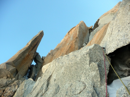Na čtvrtý den ráno již cítíme vrchol. Možná kvůli tomu náš hrnec mizí v údolí, což znamená konec vody a tedy nejrychlejší cestou dolů – vlastně nahoru. V další délce zmizí v údolí šroub i s karabinou - ještě, že Mejla zůstal. Natahuji délky, co to jde, často lezeme souběžně. Batohy jsou stále těžké, ale vrchol je blízko. Konečně jsem na hřebenu a koukám na Grand Jorasses. Zrovna vychází sluníčko a otvírá naše zalepené oči. Radost však nepřichází. Ještě je brzo. Duše je stále v hluboké meditaci. Čeká nás náročný sestup. Tak, jak jsme vystupovali pro nás  neznámou stěnou, tak sestup je úplná jízda tmou. Slanit ? Ale kudy přesně ? Kolik to vlastně bude slaňáků – deset nebo dvacet ? No, nic, jdeme na to.