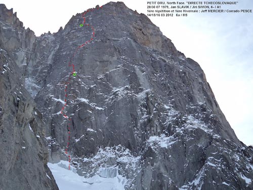 Jeff Mercier a Corrado Pesce zopakovali po 33 letech pravděpodobně jako první českou cestu od Jirky Slavíka a Jana Šimona z roku 1979 v severní stěně Petit Dru v Chamonix. Byl to také první zimní přelez.