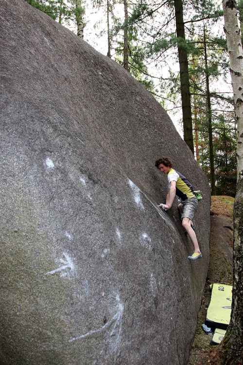 Martin Spilka přelézá jeden z boulderů určených pro open MČR v přírodním boulderingu, „Flop“ 7B (nikdo z přelezců ho nevylezl flopem jako autor)