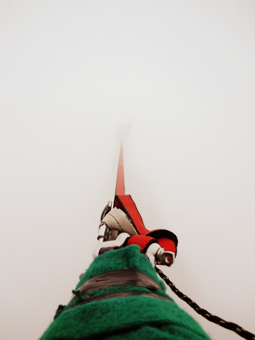 Týpek z lanovky si Kwjeta s Márou pamatoval z loňska, kdy tu byli navrtat náhorní stranu lajny. (Kensy a Müller tuhle stranu v roce 2010 kotvili za frendy) Je hrozně upovídaný a má něco na srdci, jenže mu moc nerozumíme. Asi nás varoval před počasím. Když nahoře vystupujeme z kabiny naskočí nám husina. Poprchává a je tak o patnáct stupňů míň než dole. Razíme do bivaku, luxusního bivaku pod obřím šutrem.
