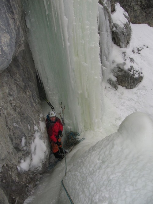 První, kde jsme na lezení zavítali, byl led asi 12 km od Goldenu - PrettyNuts WI4, který je hned u cesty. Přístup k němu byl hodně krátký, auto jsme nechali na odpočívadle a zbylých asi 500 m došli pěšky. Led už na první pohled vypadal parádně a říkám si, jo, to má asi 50 m. Takže jsem do toho nalezl, libuju si jak se parádně leze, skoro celý led za mnou a už vidím štand a v tom lano „cuk“ a už nejde dál a říkám si „sakra co je?“. Ale nenapadlo mě, že to muže být konec lana a dole na mě Kačka volá, že už došlo lano, ale já ji v tom hluku od aut neslyšel. Nakonec jí došlo, že nezbývá nic jiného, než ten kousek lézt nasouběžko.