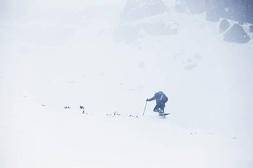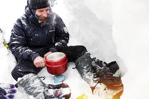 Ze sedla Váhy se k nám přikloužou dva skialpinisti. Prej nahoře není vůbec nic vidět tak to zabalili kousek pod vrškem. Když se jim chlubíme našima bludkama uklidňujou nás, že minulej tejden se tu za chalupou prásknul Viktor a to tady zná každej kámen. My máme ještě tak hoďku a něco, než budem muset šupajdit dolů. Nemá cenu to hrotit. Dojdem do Váhy, tam si zkusíme cepínem cvičně udělat záhrab a uvaříme polívku. Rysy nám neutečou. Jak řekli, tak udělali, akorát jsme nevybrali optimální flek, takže to bylo jen takové závětří, ale na uvaření stačilo. Usadit, vařič mezi nohy, a pomalu přidávat sníh. (Kdo to nikdy nezkoušel a chtěl by vařit ze sněhu, tak nacpat ešus sněhem a podpálit pod tím vařič nefunguje. Musíte sníh přidávat postupně aby se vám do něj nevsákla všechna voda a neohřívali jste v ešusu kostku ledu.)
