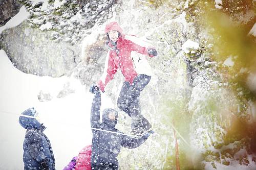 Sněží a je teplo. Dneska to bude jezdit. Nahoru nikam, takže hurá do Zlomisek na slackline, plus potrénovat nějaký fígle na jištění v prudkém sněhovém svahu. Tahat to přes nějakej žlab, když zezhora každou chvíli může přijet trambus je nesmysl, tak nám stačí najít dva stromy. Aspoň si dám do batohu dva UFOny na zkoušení, kdybysme náhodou šli kolem nějakýho šutru se spárou. Šouráme se po sněžnicích dolinou. Lidí jak na Václaváku, nikdo se nikam nahoru necpe. Vlevo přes potok vypadaj dva stromy dobře a ještě je poblíž jakási skalka. Tak jak to natáhnem? Hele tady je spára a členitá. Koukám do ní. Na UFOny jak dělaná. Fouká a sněží, proto volíme kratší lajnu (něco mezi 15ti a 20ti metry), na které si můžem zablbnout všichni. 40 by bylo akorát pro Janu a zbytek by mohl jen závistivě koukat. I tak ji Jana dala jako jediná, protože konec vyšel cca dva a půl metru vysoko a to mi ve větru, sněhu a pohorkách hlava jaksi nebere. Asi málo trénuju nebo co... Vyrochněný ve sněhu si ještě deme vyzkoušet provizorní jištění "přes botu". To funguje následovně: na co nejprudším svahu s dobrým dojezdem si uděláte klouzačku. V rámci toho jsme si všichni vyzkoušeli, že zabrzdit cepínem poté co uděláte kotrmelec není vůbec jednoduchá záležitost. Kotrmelce nebrat. Figurant se přiváže na špagát a má za úkol sjet klouzačku a strhnout jističe sebou. Jistič si udělá ve sněhu stanoviště, nakročí nohou a podává lano, když se ten nahoře rozjede, jistič se snaží co nejrychleji dobrat lano a když ho jezdec míjí, pořádně „zašlápne“ nakročenou nožku, přehne lano přes nárt a "v teplejch se snaží jezdce zastavit". Podle situace jistič není přivázanej k lanu, takže kdyby borce náhodou nechytl, tak nebude stržen za ním a může ještě ledacos zachránit. Jako obměnu je možné do sněhu zašlápnout cepín a lano cvaknout karabinou do něj. Tolik teorie. V prvním pokusu se mi daří Janu strhnout ve chvíli, kdy už mě téměř zastavila. Ležíme dole a chcechtáme se na celý kolo. A pak že je nacvičování nuda... Samozřejmě to nebyla chyba její ale Kemy, kterej jí "nedostatečně" upravil stanoviště. Veselá inspirativní scénka, zejména pro spokojený manželský život, řekl bych. :) Další pokusy strhnout jističe selhávají a všichni si libují jak taková jednoduchá věc pěkně funguje. Výborně vyválený se smrákáním skotačíme na chalupu. Cestou okukujem takovej ledovej sopl ve skalní stěně kousek nad chalupou a dohadujem se, že do něj zítra zkusíme klofnout cepínem.