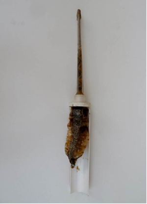 Na obrázku je detail vyústění patrony. Pokud se nespotřebuje patrona celá a ukládá se pro další použití na delší dobu, je dobré odšroubovat špici a vyčistit kanálky alespoň do hloubky 5 mm. Ještě lepší je vnitřní kanálek (na černou složku) lehce zaplnit vaselinou. Při opětovném použití je nutné začátek znovu odstříknout a zkontrolovat, zda dochází k mísení. Po delším uložení někdy dochází k zatuhnutí černé složky a k nesprávnému mísení. To je časté u patron, které jsou uvedeny na začátku tohoto pojednání.