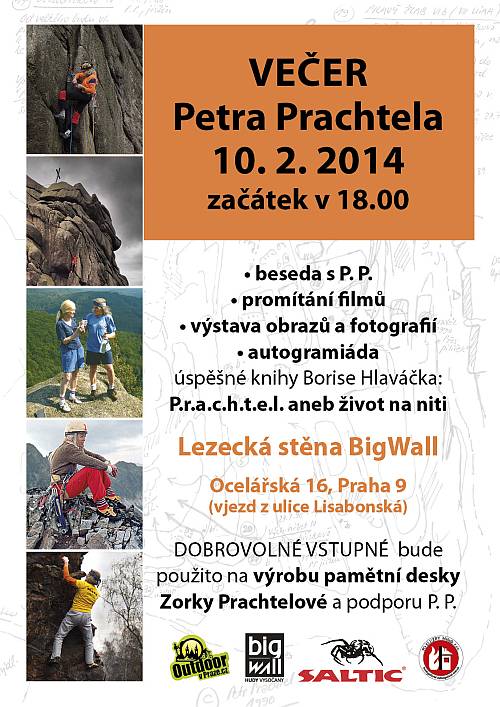 Večer Petra PrachtelaJe tomu 3 roky, co nás opustila významná horolezkyně a skvělá kamarádka Zorka Prachtelová. Na její počest se v pondělí 10.2.2014 uskuteční v lezeckém centru BigWall v Praze benefiční večer s Petrem Prachtelem, jehož výtěžek bude věnován na zhotovení pamětní desky Zorky.