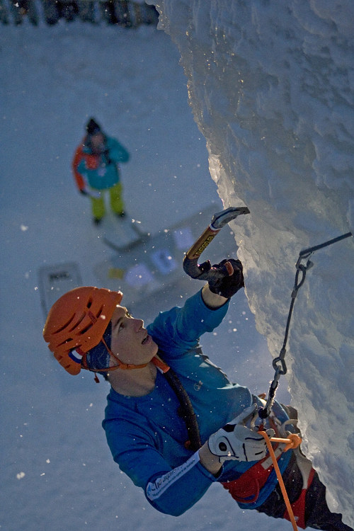 Babská kvalifikace je hodně v ledu a pak dolez po dobrých ve větším převisu. Obě chlapské jsou tahavé lezení v drytoolingu až do stropu, krux na strukturu a dolez.  Jako první lezl Tono, takže bohužel nemá žádné fotky, ale lezlo se mu v pohodě, jen po přechodu na strukturu někdo otočil vypínačem a to bylo vše. Já jsem se pro jistotu trochu zdržel už o kousek níž, ale dolézám ke kroku na strukturu, přesahuju a jen si pomyslím že to si asi dělají prdel, následuju Tona aniž to v tu chvíli tuším. Takže nakonec z toho máme dělené 15. místo ve skupině.