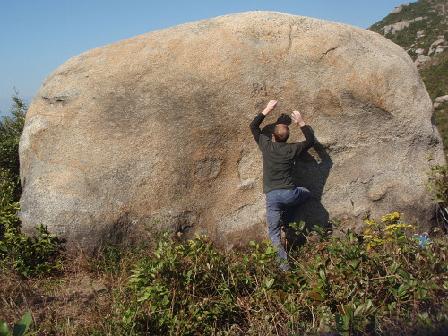 Pokračujeme po cestě okolo ostrova skrz banánovníkové háje a ospalé vesničky. Pak zatáčíme doprava do schodů a jdem asi kilometr až na vrchol kopce Ling Kok Shan. Jsou tady nádherné balvany, které nejsou vůbec zakresleny v průvodci. Asi se na ně občas leze, ale místní nechtějí, aby se tu rozjel velký bolderingový boom, tak je nezveřejňují. Starší směry jsou v průvodci zakreslené, a nakonec je zvládáme najít. Dotýkám se skály. Konečně pár boulderů po nemoci na rozlez. Doslova hojivý dotyk kvalitní žuly. Se zavřenýma očima si člověk skoro myslí, že je zase doma někde na Petráči, asi takový je charakter zdejších boulderů. Nejdéle jsme zůstali v sektoru Pagoda boulders (jméno podle pagodového altánu pro turisty - viz foto níže).