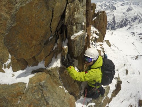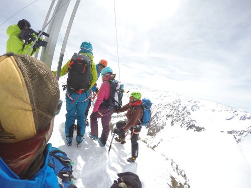 Ten druhý se, díky sv. Petře, ukázalo ono „panoráááámatové počasí“. Takže klasika – vláček, gondola, sedlo Mittelbergjoch a na platu pod ním první kroky na pásech na kopec. Ke Karlovi se přidává ještě jeden místní horský vůdce, aby se postaral o naše kameramany. Prvních 600 m zastavujeme na natáčení asi jen třikrát, držíme se časového plánu. V sedle, odkud výstup pokračuje na mačkách, zbývá trochu času na natočení pár synchronů a pak už „jen“ posledních asi 100 m ke kříži. Že bychom si nějak panoráááámat užili, to tedy ani omylem – poskládat na plochu, kterou tahle špičatá divoká na svém vrcholu nabízí, 8 lidí i s technikou, to nebylo na nějaké rozhlížení se po kraji. Foukalo a vyloudit z obrazově relativně normálního rozestavění lidí u kříže i zvuk, kterému by bylo ve výsledku rozumět, to byl oříšek. Původně nás tam mělo být logicky 9, ale Helclik se namísto bitvy o výškové metry rval dole v posteli s rýmičkou. Ovšem stejně statečně! Každopádně škoda…. Právě on by si totiž na rozdíl od nás jízdu dolů užil určitě i v té krustě na prvních asi 150 výškových metrech. Naštěstí o kousek níž na ní zůstalo – aspoň v místech před větrem chráněných - asi 20 cm prašánku po sněžení z minulého dne. To už byla radost pro každého z nás.