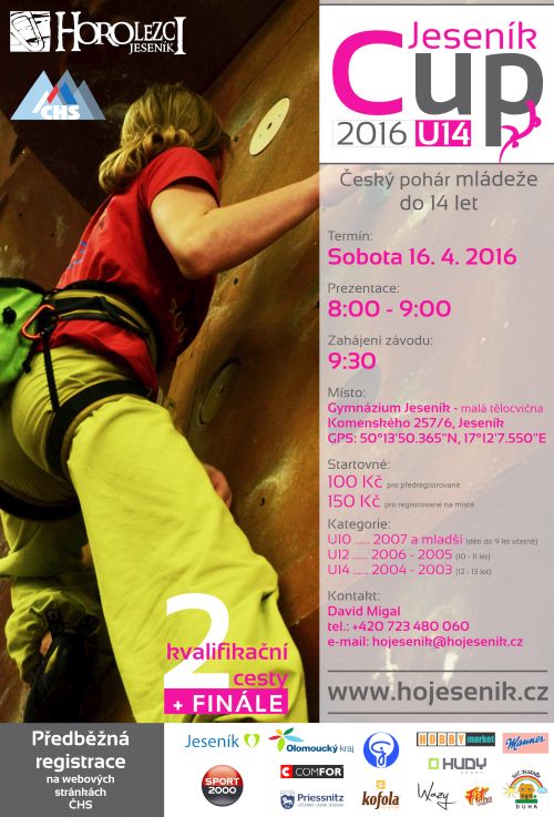 HOROLEZCI Jeseník, z.s. ve spolupráci s Českým horolezeckým svazem pořádají Český pohár mládeže do 14 let.