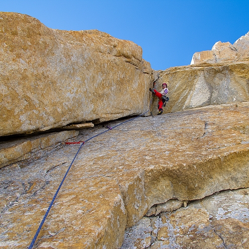 V pondělí už bereme pouze jednu svini a malý baťůžek, a když začne do stěny svítit, tak vyrážíme. Rychle žumarujeme zafixované délky a pokračujeme ještě tři délky mírně položenou plotnou, kterou protíná různě široká spára. Když končí, absolvuji kyvadlo do další, která nás přivádí na 15. štand. Odtud se stěna napřimuje a místy nás vyhazuje do převisů. Začínám toho mít dost. Obtížnost neklesá, a pokud tak mírně a pro jistotu v trhlinách a spárách přibývá led a sníh. Dostáváme se do stínu, a tak začíná mrznout a mně přibývá i přes spárové rukavičky krev na rukách.