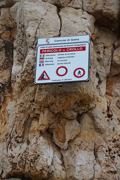 Zákaz na skalách na pláži trvající již několik let (od 2010) je prý z důvodu pádu skal, ale s největší pravděpodobností se pod tento vágní popis schovává i zastaralé jištění, což je asi hlavním důvodem. V těsné blízkosti moře jištění, které nemá korozivzdorné parametry dost rychle degraduje a tak město Gaeta, pod které oblast spadá, ji pro lezení uzavřelo.