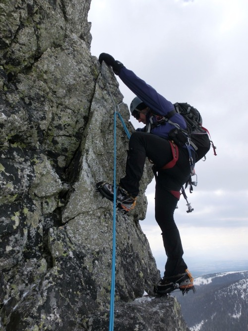 Ale pozor, k hřebeni se dostanete jen v zimě. V létě je přístupový žlab uzavřený kosovkou. Které si v zimě za normálních sněhových podmínek ani nevšimnete. Letos při sestupu jsem si pak všiml možné letní nástupové varianty, a to ze strany od turistického chodníku do sedla pod Ostrvou. Avšak jsem jí ještě nezkoušel a ani nevím, jak kvalitní je zde skála.