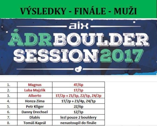 Po kvalifikaci se Andrejko se svojí družinou pustili do přestavby na finálové bouldery. Výsledky se sečetly a po čtrnácté hodině se mohlo jít na věc. Do finále se probojovalo 7 finalistek společně s Ójou Mázlem, který tak doplnil osmičlennou finálovou sestavu. Lezlo se stylem první pokus OS + další 3 pokusy. Bylo opravdu na co koukat.