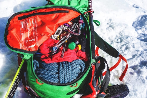 • 4x camalot, 4x vklíněnec, 1x šroub do ledu, 4x ,,alpine" expreska (malá drátovka - 60 cm šitá smyce - malá drátovka), 2x šitá smyce 120 cm, 4x karabina šroubovací