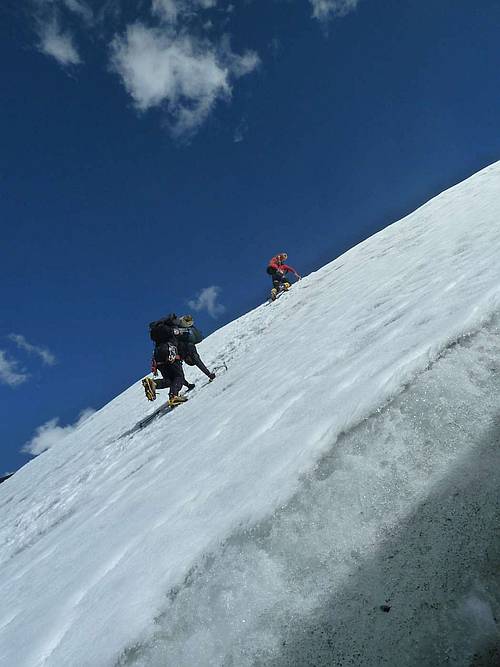 Gogo přes ledovec, uprostřed ledovec našeho výstupu a na obzoru hřeben normální cesty (hi res)