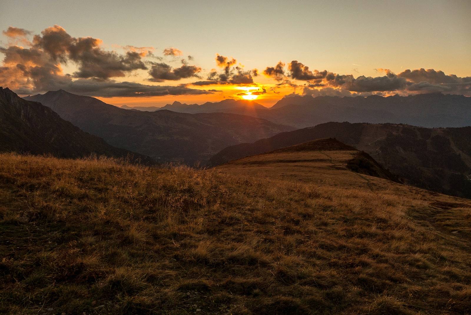 Zatím nevíme kam až se nám bude chtít, plán je totiž dorazit v pondělí večer na Tete Rousse a na to máme času dost, prostě se uvidí. Stoupáme okolo sedla Col de Voza a pokračujeme dál směr Bellevue. Nad náma se týčí kopeček Mont Lachat, kterej vypadá, že by z něj moh bejt hezkej výhled na západ slunce, to bude ale chtít trochu hrábnout do podrážek, protože slunce už je docela dost nízko a máme to nahoru přes 300m. Nasazujeme tak smrtící tempo a docházíme naprosto ideálně ve chvílí, kdy sluneční kotouč mizí v mracích na obzoru.