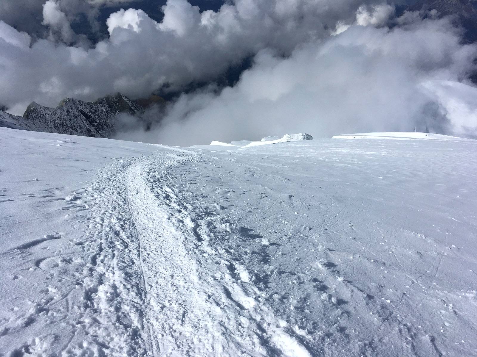 Nastupujeme tak tedy pomalu do "stěny" pod Gouterkou. Když se někdo hrne divoce nahoru, pouštíme ho a držíme si svoje bezpečný tempo, není totiž kam spěchat. To si ovšem bohužel nemyslí i ostatní.