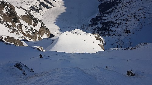 Se Slovákem Jožem Capcarou (Karel Svoboda se po odchodu Simona do nebe rozhodl dále lyžařské extrémy nepokoušet) jsme týdny sledovali počasí a nakonec na poslední chvíli trefili přesně den, kdy v těžkých pasážích byl skvělý firn na slunci a ve vzdušných a nebezpečných ve stínu stabilní prašan. Z vrcholu, vysokého 2408 m, jsme startovali už před osmou ráno východní skalnatou stěnou se sklonem kolem 50°.