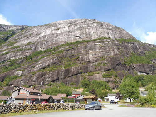 Ďalší deň doklepneme zbytok cesty, tentokrát kúsok aj bez asfaltu a okolo obeda sme na náhornom plató nad Kjeragom. Víta nás obrovské novučičké parkovisko, z ktorého vyrážajú turisti na jednu z najväčších nórskych atrakcií takzvaný Kjeragbolten. Ide o mohutný balvan zaseknutý medzi dve steny na  hornej hrane Kjeragu. Pre správneho turistu v Nórsku priam neexistuje väčšia výzva ako na tento balvan zoskočiť a nechať sa tam vyfotografovať. Z parkoviska k boltenu treba síce zo 3-4 hoďky šliapať, ale zjavne to ľudí neodrádza a kvôli tomu tu dokonca vybudovali pred pár rokmi príjazdovú cestu cez vnútrozemie. Predtým sa tu dalo dostať iba trajektom. Takže vďaka ti Kjeragbolten, že si sa tak dobre zasekol, inak by sme sem museli dotrajektovať a zo steny by sa zostupovalo o pár hodín dlhšie. Po ceste sme čo to vygooglili, ale skutočnosť zas raz predčila virtuálnu realitu. Už len jazda po ceste dole do fjordu je zážitok. Aj Passo di Stelvio sa nám zdalo akosi o dosť  menej strmé. Z internetu sme zistili, že Kjerag je vlastne súčasťou stien, ktoré tvoria jeden z najkrajších nórskych fjordov Lysefjord. Lysefjord je 42 km dlhý, miestami len 600 m široký fjord, ktorý je z oboch strán ohraničený stenami až 1000 m vysokými. Hrana steny Kjeragu čnie nad hladinou mora do výšky 984m.