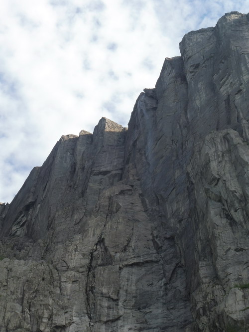 Našťastie samotná stena Kjeragu nezačína priamo z vody, (ako napr. vedľajšia stena Smellveggenu), takže výška steny je o čosi nižšia. Dopátrali sme sa k číslu 805 m. Stenou tečie jeden z najvyšších vodopádov na svete Kjeragfossen, ktorý sa väčšinou v lete rozplýva v povetrí, lebo horná časť steny je previsnutá, takže vodopád letí vzduchom. Kjerag je pre svoju výšku a strmosť veľmi obľúbenou destináciou pre base-jumperov. To nám vlastne dosť uľahčilo transport, lebo miestna base-jumperská cestovka ich chodí každý deň loďkou vyzdvihnúť na skalný výbežok priamo pod stenu.