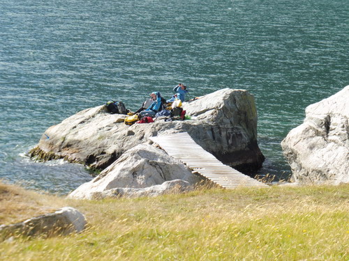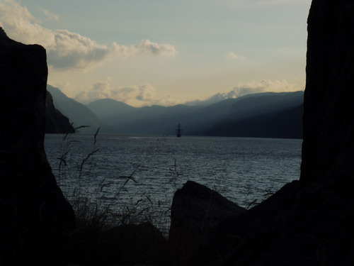 Ešte dostávame inštruktáž kde nestavať stany kvôli doskočisku a sme tam, kde by som si ani vo sne nepredstavil, že sa niekedy ocitnem. Toto je priam neskutočná paráda. Rovno pod Kjeragom do mora vybieha malý polostrov. Asi tak 5 metrov nad úrovňou mora je na ňom parádna rovinka porastená mäkkou trávičkou a idylicky rozhádzanými bouldrami krásnych tvarov. Z jednej strany mohutné  steny z druhej strany tmavomodrá voda fjordu...  ...a za ňou znova steny.