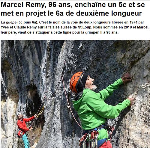 Před dvěma lety jsme psali o 94letém švýcarském horolezci, jak leze 450metrovou vícedélku v Alpách. A Marcel Rémy stále leze. Francouzský lezecký magazín Grimper přinesl zprávu i s fotkou, že nyní ve věku 96 let dal 5c a pouští se s elánem do projektu druhé délky této cesty za 6a.
