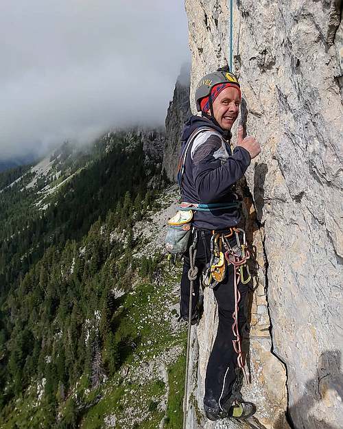 Další pasáž je na mně. Po vytrvalostním lezení po dírkách a později velkých kapsách dolézáme na starý štand do staré cesty. Zde ukončujeme naše snažení a na vrchol nedolézáme, neboť nám to přijde zbytečné a nemáme na to hlavně čas. Pomalu slaňujeme celou naší cestou a všechny volné kameny a kamínky posíláme do údolí. Některé pasáže lehoulince zevropšťujeme:)