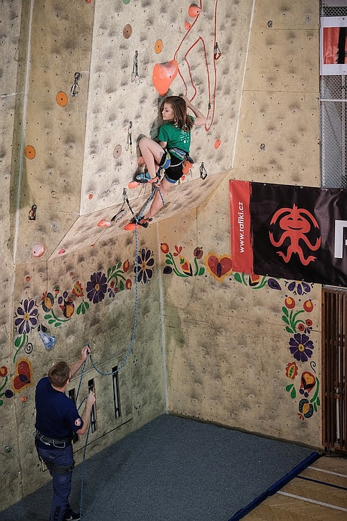 Na výborně připravených cestách od Azbesta proběhla nejdříve dvoukolová kvalifikace stylem flash (děti flash TR), ze které postupovali nejlepší do finále, lezeného na OS. V dívkách U12 se představila jen tři děvčata, která byla věkem spíše U10, ale věřím, že i tak si atmosféru velkého závody všechny tři užily. Zvítězila Natálka Kvapilová (Vertikon Zlín). Mezi chlapci, kterých bylo 5, už byli již znatelné výkonnostní rozdíly a svou roli hrála i zkušenost s lezením na ostrém konci lana. Nástrahy prvního břicha vyřadily Řepku. Ondra Kvapil se dostal až téměř do stropové části. Pak nastoupil Dan Školař (Rocky Monkeys Sokol Brno 1), který cestou celkem v pohodě prošel až do TOPu a zajistil si tak první místo. Za ním se vydal do finále Filip Lebloch hájící barvy domácího HOUBu, který těsně před koncem stropu trochu zazmatkoval a z cesty vypadl, což mu nakonec stačilo na druhé místo. Posledním finalistou byl Juraj Gondžůr (K2 Žilina), který tak dlouho bojoval v první části stropu s přelezem do snížení, až se definitivně unavil a skončil třetí.