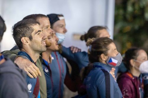 Ela na bedně a zbytek týmu zpívá českou hymnu (f: Jan Virt)