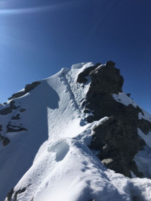 Počasí je opravdu pěkné, ale je až moc teplo a firn se mění v pekelnou břečku. Ráno jsme měli vyrazit dříve a na hřebeni jsme se neměli tak dlouho zdržet. Dvousetmetrový sestup padesátistupňovým mixem rozbředlého sněhu a suti je nepříjemný. Dvě délky slézáme, pak slaňujeme, protože měkký sníh by mohl ujet, což byla reálná obava, jak nám o dvě hodiny později ukázala mohutná lavina na úbočí Gross Fiescherhornu. Jakmile se sklon zmírnil, sestupujeme dál bez lana a v poměrně čerstvém rozbředlém netransformovaném sněhu se boříme místy po kolena. Chvíli šlape Patrik, když toho má dost, střídám ho. Zábava skončila, sestup na Ewigschneefeld je pomalý. Stavíme jen na napití a shození jedné vrstvy. Dole znovu stavíme, snažíme se z tyčinek načerpat energii na pekelně dlouhou cestu zpět do sedla pod Mnichem. Kdo tam byl, ví o čem mluvím. V nižší části cesty, kde předtím pršelo, jsme se tak nebořili, ale výše, kde před pár dny nasněžilo, jsme se opět bořili nad kotníky. Na chatu jsme došli až po osmé hodině, po 1540 výškových metrech nahoru a dolů a 12,7 km. Sníh nám vysvětlil, že ráno nelelkovat a cestou taky nelelkovat. Vzhledem k tomu, že nás tímhle směrem čeká ještě Finsteraarhorn, už se nemohu dočkat, až to zase pošlapu nahoru. Nebo, že bychom to příště vzali dolů přes Fiescheralp?