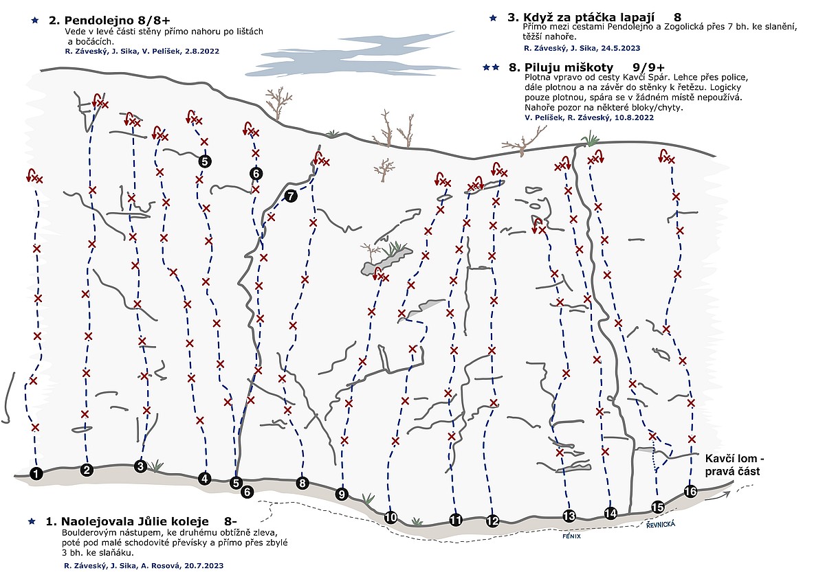 V oblasti Kavčí lom přibyly 4 nové cesty. Jedná se o cesty v levé části stěny:
