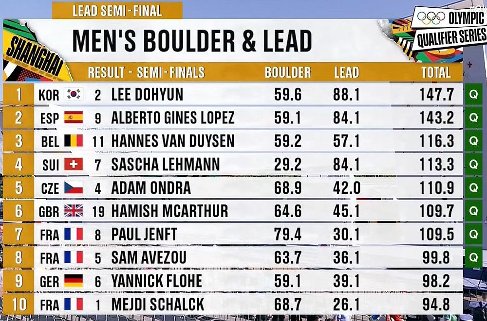 V semifinále v lezecké kombinaci na olympijské kvalifikaci v čínské Šanghaji skončil dnes Adam Ondra na 5. místě a postupuje do zítřejšího finále.