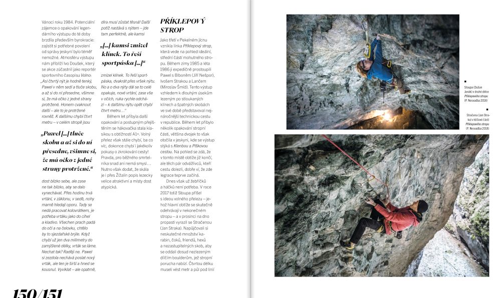 Neopomeneme také dodnes kultovní cesty, budící pro svou odvážnost respekt všech lezců: Znáš to, zlý sen – stojíš a držíš se čehosi v rozbité skále, přírodní kamenolom a shnilé dřevo v jednom. Poslední jištění je štand. Na co sáhneš, to upadne a s hororovým rachotem se roztříští dole v údolí… Jsem durch propocený, co minutu cítím, jak mi stékají pramínky horkého potu po spáncích přes krk hluboko na záda. Pocit, jako když teče teplá krev. Vlastně už chápu, proč se říká „potit krev“… Vše má ve své moci strach a hazard, dva nerozluční kumpáni. Krásné na těchto snech je jen probuzení, kdy pomalu přichází úleva a v jejích stopách opojné štěstí, že to byl jen sen. Jenže dnes to sen není…