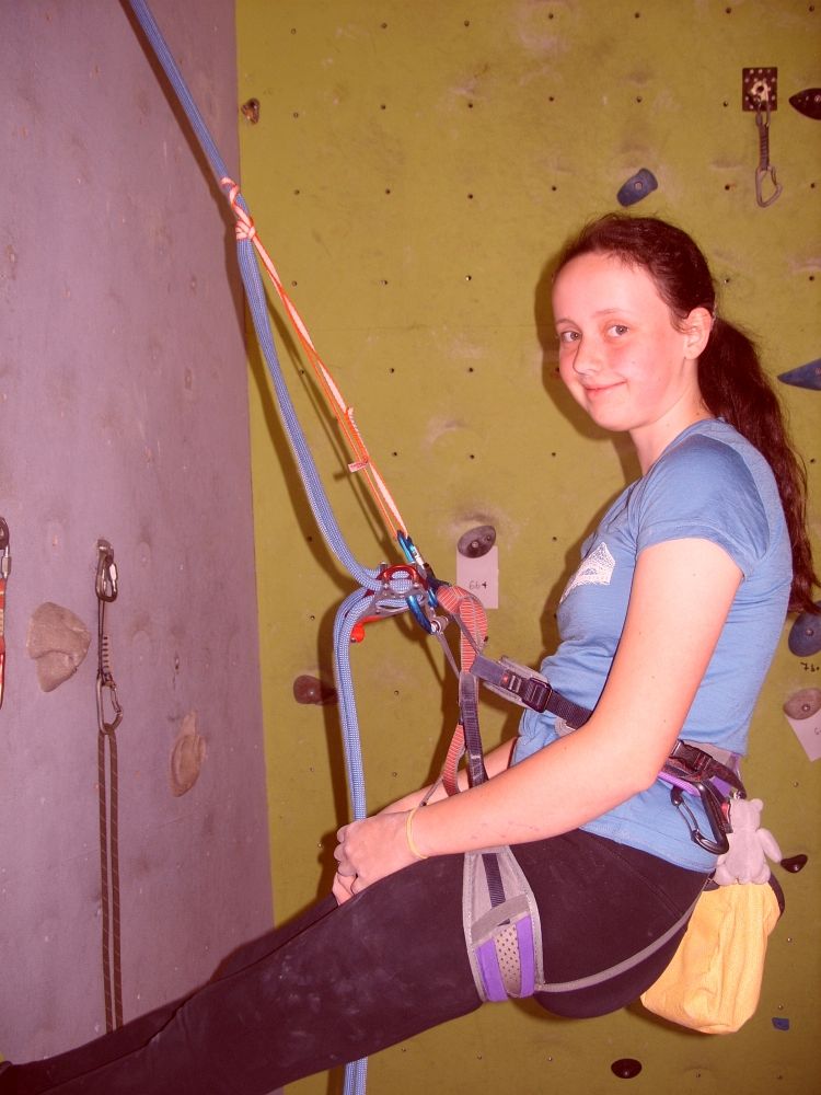 na prvním velkém obrázku je špatně snad úplně všechno. ošklivým nesrovnaným osmičkovým uzlem počínaje, přes více než metrový podivně zašmodrchaný a překážející zbývající konec lana, po prsák evidentně neseřízený na velikost hrudníku. lidová tvořivost s prusíkem (prodlužujícím prsák a vytvářející ohromný překážející trojúhelník před zvláštním způsobem navázání týraným děvčetem je jen třešničkou na dortu.