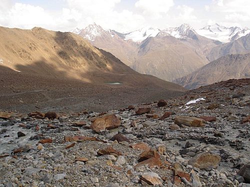 Cesta ze sedla k chatě se nám zdá nekonečná, zejména měsíční krajina po ústupu ledovce není moc příjemná pro kolenáře.