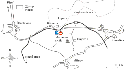 Dejte se doleva k východu po lesní cestě až po 800m dorazíte k hájovně, od níž jsou skály asi 100 m směrem na jih.