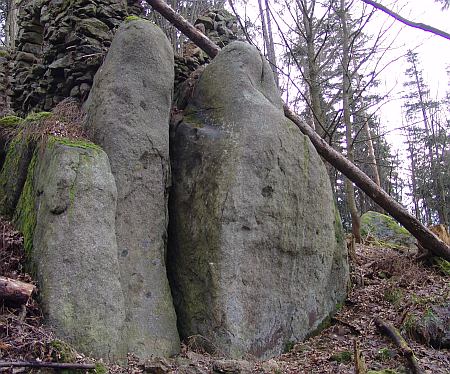 Úplně vlevo boulder Lišta podšitá 6A+ lezu Koutek fikaný, 5B v pravé části kamene vede ještě boulder Krajní 4 , přes výrazný tmavou bouli