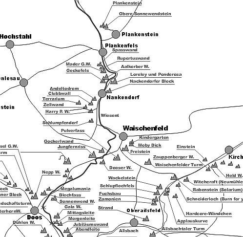 (území se tak nejmenuje, ale to slovo ho pěkně vystihuje). Začátky lezení zde byly oproti jiným částem Frankenjury skromnější. Větší rozvoj nastal až v 80. letech se spolu s kvalitním jištěním Bühlerovými háky. Největší rozmach přišel až v 90. letech díky Stefanu Löwovi vytvořením nových cest na Mader Gedenkwandu a Rolandu Kraftovi, který na podzim roku 1997 otevřel Freudenhaus. Nakonec objevitelské nadšení místních vyvrcholilo „Kvakolandem". Pak je tu řada dalších skal, ale musí pro vás zbýt nějaký prostor pro objevitelské nadšení.