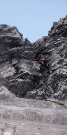 Viky k překonání dostane lano od první dvojky a překonává trhlinu skoro kolmým mixstylem, já to zkouším zleva a po pádu sněhového mostu musím jeho styl zopakovat. Navazujem hovor a zjišťujem, že jeden z dvojky před náma se podíval trhlině na dno. Vrtáme šrouby do hnusného ledu pod ještě hnusnější první délkou, kterou leze řízek před náma skoro hodinu snažíc se zabořovat skoby do zmrzlých kostiček vápence.