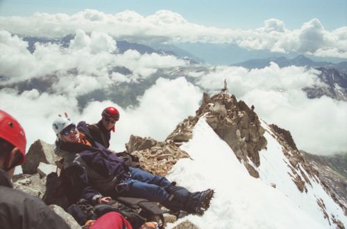 Vychází slunce, nahříváme se na sluníčku. Pak lezeme kus po skalním hřebeni (jedno místo III) a doprava na visutý ledovec. Po něm stoupáme přes několik trhlin, pak doleva přes okrajovku do severní stěnky (20m 60°, pak ledový hřeben 45° až na vrchol) dál po strmém hřebeni. Myslím na Pány horolezce Galleta, Mullera a Balleyse, kteří tudy šli v roce 1901...