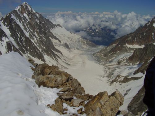 Z druhé strany přicházejí dva angláni. Vypadají na šrot, jako kdyby sem vylezli nějakou severní stěnou nebo co. Ani se nezdrží, jen si podali ruce a hned šli zase dolu. Jdeme chvíli po nich, sestupujeme normálkou po hřebeni na rameno 3774m, pak „delikátním kuloárem“ dolu na ledovec. Už rozumim proč angláni byli tak hotoví - co se neviklá to aspoň duní.. Kus slézáme, pak 3x slaňujeme, Káča vlní lanem a hází po nás šutry (co jsme jí provedli?!) Za rohem se pořád něco sype, připadám si jako myš mezi pastičkama a chci pryč.