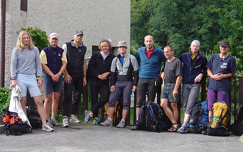 Členové a lektoři prvního běhu vzdělávání podle požadavku IFMGA: zleva Jan Bednařík, Viktor Kořízek, Dušan Stuchlík, Hans Bergman, Karel Kříž, Josef Šimůnek, Josef Morávek, Radek Lienerth a Antonín Volk