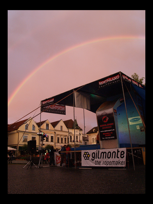Desiatove balicky super, rozliezacka super, mikrobus super, duha na fotke super :-) Muzska kvalifikacia ukazkova, zenska.. hm, tazko to nebrat osobne, ale aj tak sa mi tie bouldre zdali tak nejak bez fantazie, take silove, typicka zhybovacka a vysoke boli hned vo vyhode.. Pri skoku urcite chybal "manipulacny" priestor. Zenske finale klasika, v muzskom mi chybal nejaky ten pravy boulder boulder po prijemnych oblinach, pripominalo to skor minicesticky listovacky, podaktori si mozno zbytocne aj prsty poodpalovali (opravte ma prosim ak sa mylim). Rozmiestnenie bouldrov super, v jednej chvili vo finale dokonca topovali traja naraz , uau ;) Mozno je na skodu, ked jeden stavitel robi striktne jednu cast, keby sa to pomiesalo, hned by to bolo rozmanitejsie.. Dufam ze neva, ja len v dobrom, zeby nam na tom nasom malom Slovenku bouldering aj nadalej prekvital :-) Vdaka za skvely pretek