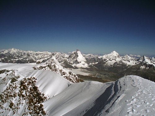 Předpověď se vyplnila a ráno je absolutní jasno, vynikající viditelnost a u chaty slabý vítr. Vstáváme v 5:00, kdy je už většina lidí na nohou a narváni do šatny se snaží být první na ledovci. Naše taktika je ale jiná. Nejdříve si uvaříme snídani, sbalíme věci, vykonáme všechny nutné ranní potřeby a jdeme omrknout situaci před chatu. Šňůra postaviček na ledovci Felikjoch nás ale nechává chladným. Jsme si jisti svou výkoností, a tak nastupujeme pěkně zhurta. Několik skupina předbíháme již na mírné ploše ledovce, další poté před strmým výšvihem do sedla. Tam máme před sebou pouze dva lezce, kteří míří k raním sluncem ozářenému Lyskammu. Jdeme tedy vstříc jeho pověstné hraně. Nejdříve velmi mírně překonáváme ledovec v sedle ( bez trhlin ) a nastupujeme na předvrchol zvaný krásně libozvučně Südwestgrat schneekuppe - 4214 m.n.m. Ten se traverzuje a později vyšlapaná stopa vystoupí do jakéhosi sedla ( trhlina ) pod západní hranu. Výstup sice širokým leč mimořádně strmým ( 40° ) tvrdým firnem je otázkou stehen, lýtek a pomateného smyslu. Výška tohoto svahu je 220 metrů. S několika desítkami odpočinků dostáváme svah za sebe a pomalu a stále velmi strmě vystupujeme na vrcholový hřeben. Ten je na několika místech velmi úzký. Svahy na obě strany berou dech. Nalevo padá 1100 metrová, ledy opancéřovaná severní stěna, na jih zase 500 metrů posněžené skály. Čím více se blížíme k západnímu vrcholu, tím je hrana širší a více bezpečná. Po 3 hodinách velmi rychlé chůze jsme na západním vrcholu Lyskamm - 4480 m.n.m. Přechod na východní vrchol je velmi exponovaný a nebezpečný ( AD a III.UIAA ). Z vrcholu kde fouká zhruba padesátikilometrový vítr se nádherně prezentuje přízrak Matterhorn - 4478m se svým těžkým sousedem Dent d´Hérens, himalájský Dent Blanche - 4357m, nepřekonatelný Weisshorn - 4506m, fascinující vrcholky masivu Monte Rosa. Na druhé straně k jihu je překrásná skupina Gran Paradiso - La Grivola, v dálce Monte Viso a již k západu se klonící masiv Mont Blanc, téměř kryjící se s rozložitou hradbou několikavrcholového Grand Combin. Po 20 minutách nás dochází druhá skupina tří alpinistů a proto se rozhodujeme pomalu a opatrně sestoupit. Je mráz a fouká ledový vítr. Sestup vedeme stejnou cestou. Ze sedla Felikjoch předháníme opět několik skupin klesajících z Castoru.
