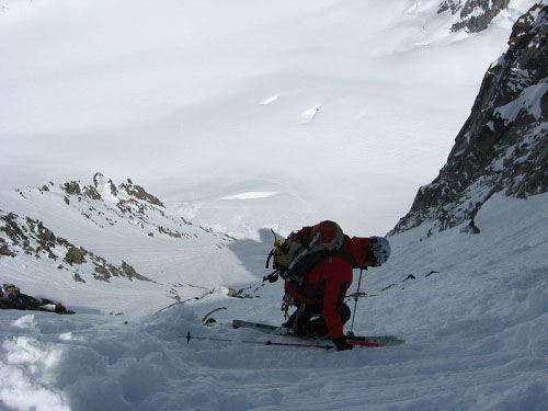 Iva s Romanem odjíždějí, další den již pouze ve dvou volíme úzký kuloár, do kterého nastupujeme poučeni z předešlého dne o několik hodin později. I tak ale v sedle pod vrcholem čekáme další tři hodiny na rozměknutí sněhu. Horních deset metrů jistíme lanem kvůli vyčnívající skále. Jízda je opepřena metr a půl hlubokým lavinovým kanálkem, který půlí už tak úzký kuloár na dvě části. Sklonu míry 45° si proto moc neužijeme, po krajích je to čistě za padesát. Je dost teplo, tak se snažíme co nejrychleji dostat dolů mimo dosah případných lavin. Rozbředlý sníh velmi dobře drží, starosti činí pouze dvojité překonávání té proklaté díry, ze které se s lyžemi prakticky nedá vymotat na povrch.