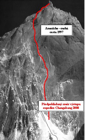 Náš cíl je vytyčit nový směr v severní stěně. Po důkladném prostudování fotografií a konzultaci s účastníky americko-ruské expedice jsme se rozhodli pro nástup vpravo od jejich cesty a těsně pod vrcholem dosáhnout SV pilíře. Cestu absolvujeme jako jedno čtyřčlenné družstvo stylem „země – vzduch“ v tzv. capsule stylu.