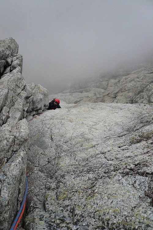 Střídání musí být a Tom se po této délce začíná soukat do úzkého komínu, kde ho posléze čeká klíčové místo cesty, převísek se spárou (čistě za VI+, jinak VI A0). Bohužel se mu nějak dostává do ruky křeč a odsedává. Prý jestli to chci zkusit čistě, tak ať ho spustím. Trochu jsem se pousmál, to že si sáhnu na skobu a přitáhnu se za ní, mi v tu chvíli vůbec nevadí. Tom to tedy dává technicky. Já to zkouším na druhým čistě, ale uklouzla mi noha a visím. I když to bylo suché, moc mi to nešlo, ale nakonec to s přitáhnutím za skobu přefunim.