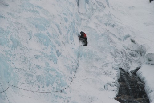 Golemiat led je se svou délkou 60m a obtížností čtvrtého stupně hodnotným skalpem. V chatě je příjemný chatař, který velmi rychle pochopil, že pokud nebude na chatě teplo, tak utečeme na jinou chatu. Proto nakládal do kamen jak na pokoji, tak v jídelně a bufetu dostatek dřeva, takže se po prvním dni syrová chata rychle vyhřála na snesitelnou teplotu a my zde nakonec vydrželi celý pobyt. Od chaty je lehké dojít pod led, stále dolinou nahoru až se octnete pod ním. První den, kdy jsme stopu prošlapávali, nám to trvalo asi hodinu a půl. Další dny již chodíme za třicet minut. Abychom nemrzli, zatímco ostatní polezou, rozhodli jsme se vykopat záhrab pod ledem. Postupně dosahoval větších a dokonalejších tvarů, takže na konci pobytu již měl dvě místnosti, boční sklepy, lavice na sezení, klenbu nad průchody a police na vaření. Nefoukalo do něj. Podivuhodné bylo, že ačkoliv jsme byli ve výšce asi 1800m, tak ani pod odkopání dvou metrů sněhu jsme nebyli na trávě či kosodřevině.