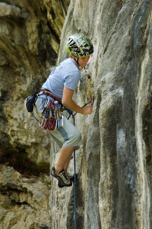 Navázala jsem se, obula, vzala si přilbu... dolezla do převisu, cvakla preso ve strůpku a místo trochu doprava, jsem to zkusila rovně vzít takovou oblinu - to bylo blbě, tak jsem spadla. Dobrala se k presu, vyklepala si a zkusila to víc zprava a to se mi povedlo dostat se na hranu, to bylo správně, ale zas jsem ještě neviděla jak dál, tak jsem opět spadla .. Pak jsem našla patu nad hranou - povedlo se mi přeskládat nohy pod hranou, přebrat to správně rukama, nastoupat, pata ... sopel, pak jsem zas nevěděla, jak z něj - takže opět pád ... a asi ne jeden... Ale kolik? To si fakt nepamatuju, a ani nepočítám. Nastoupám, hledám, zkusím, jde, nejde - pád nebo "Dobeeer!"